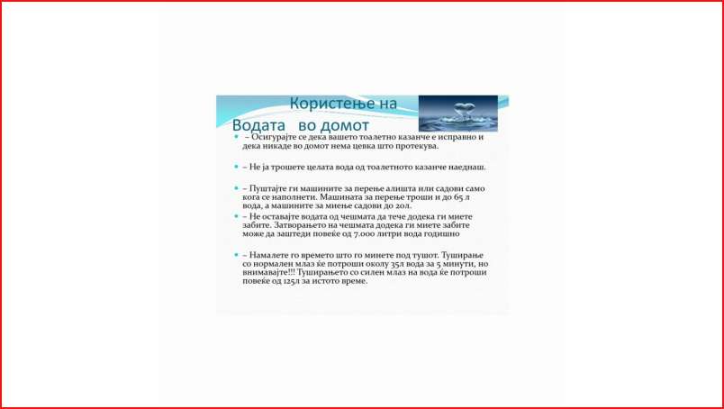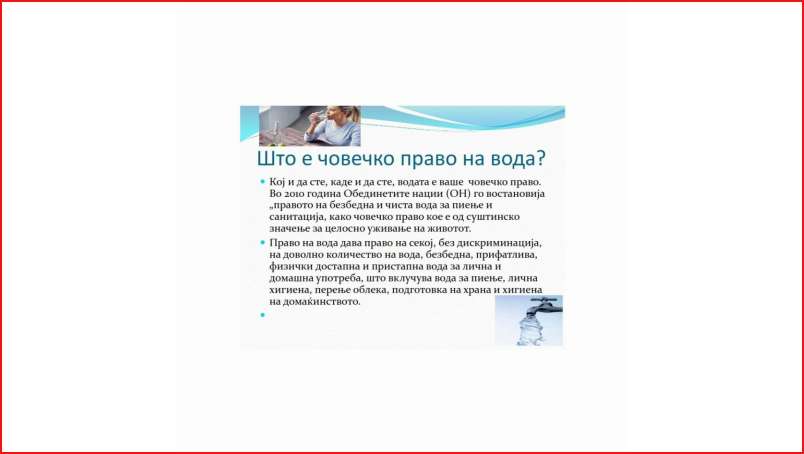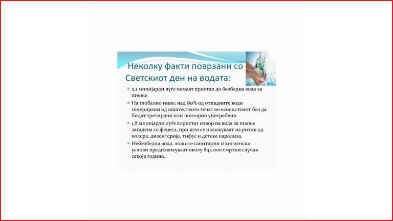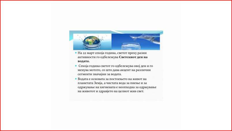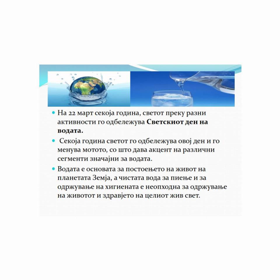По повод Светскиот ден на водата 22 март Педагог Маргарита Ставорова подготви презентација со цел да се потсетиме на значењето на водата во животот на човекот.