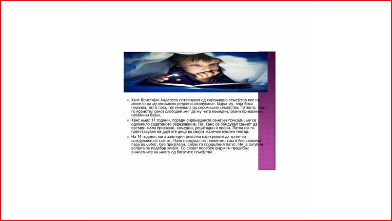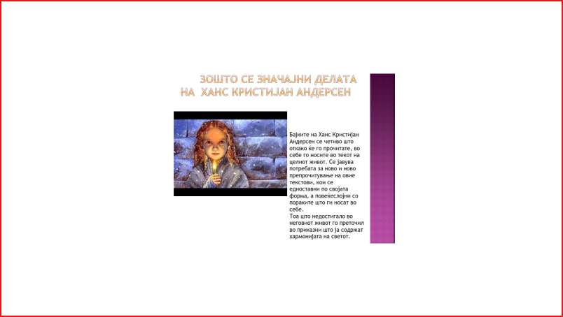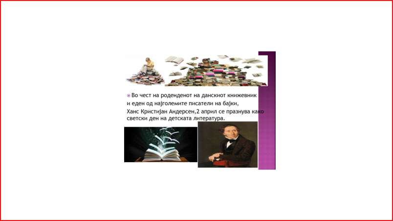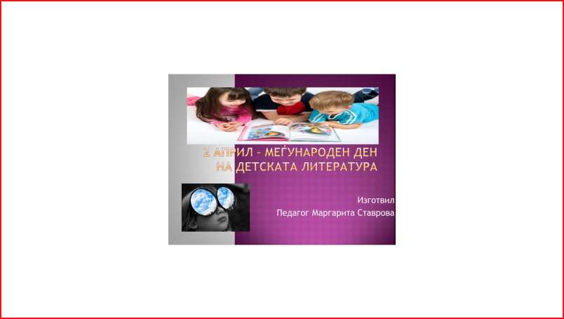 По повод 2 Април Меѓународен ден на детската литература Педагогот Маргарита Ставрова изготви презентација во чест на роденденот на данскиот книжевник Ханс Кристијан Андерсен со единствена цел да се истакне значењето и потребата од користење на детската литература уште од најмала возраст.