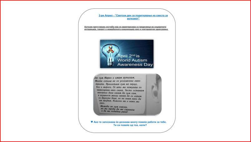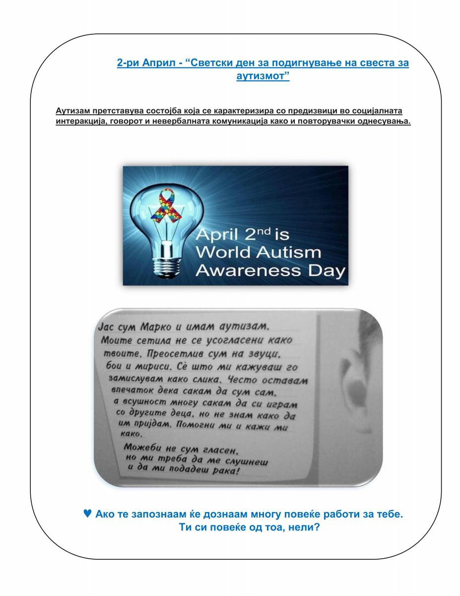 СВЕТСКИ ДЕН ЗА ПОДИГНУВАЊЕ НА СВЕСТА ЗА АУТИЗМОТ
