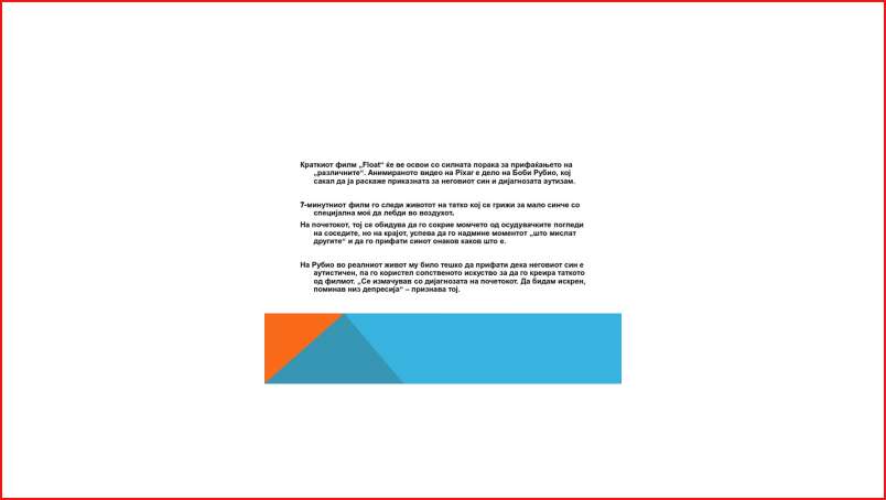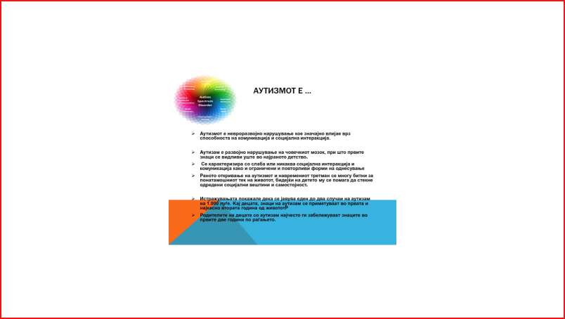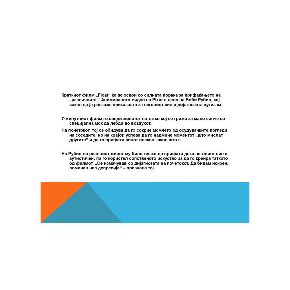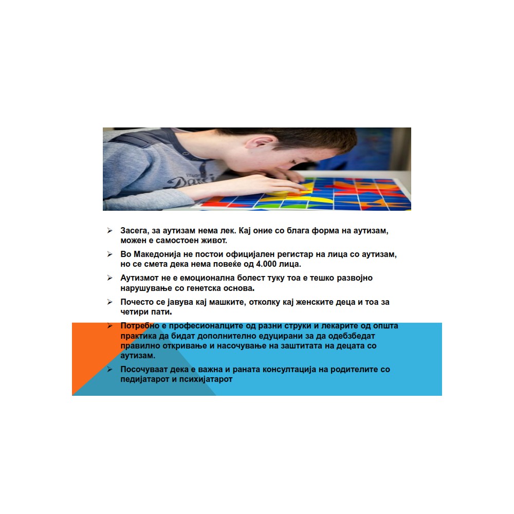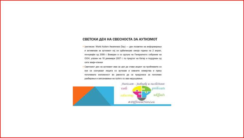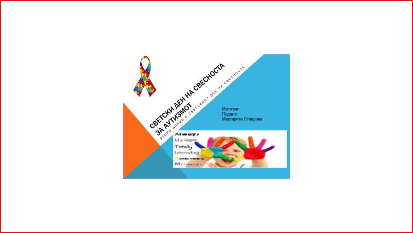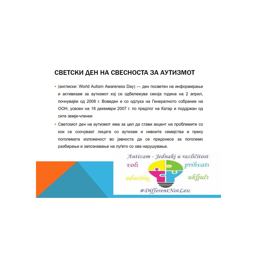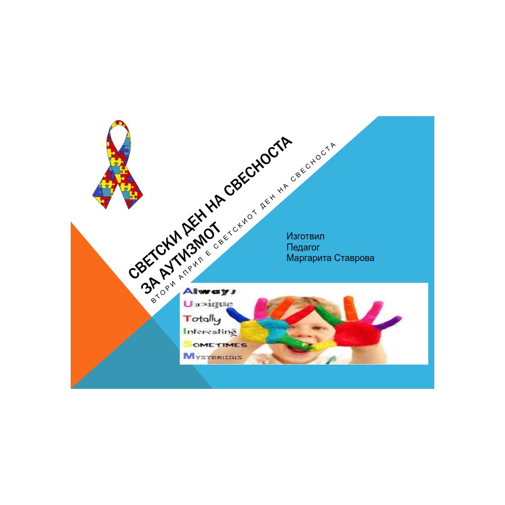 По повод одбележување на 2 Април Светскиот ден на свесноста за аутизмот Педагогот Маргарита Ставрова изготви презентација со цел прифаќање на различностите кај децата уште од најмала возраст.