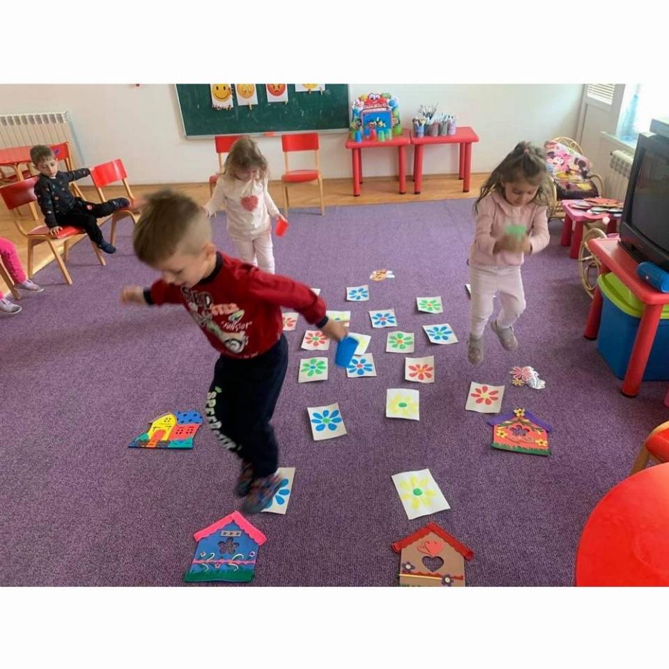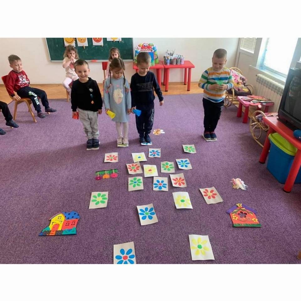Цел: Да се развиваат способности кај децата за класификација според боја; да се поттикне контрола и кординација во просторот.