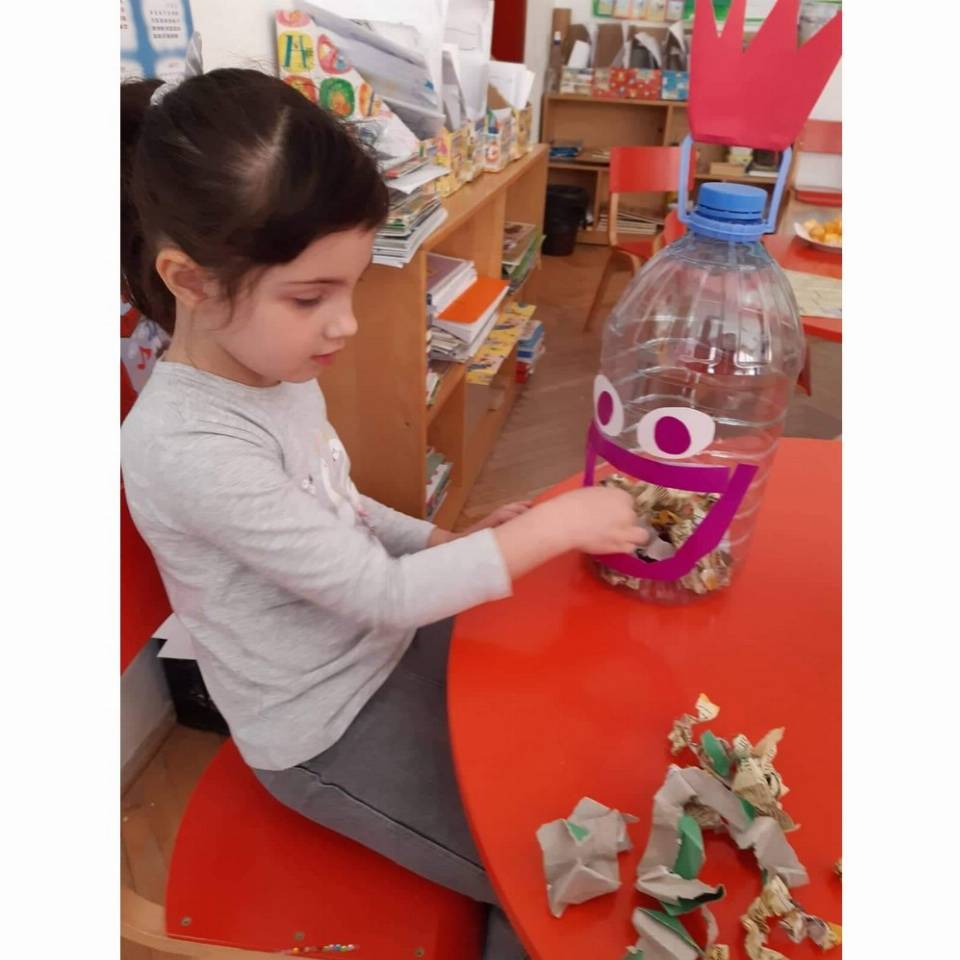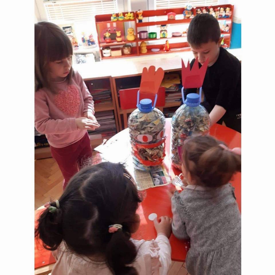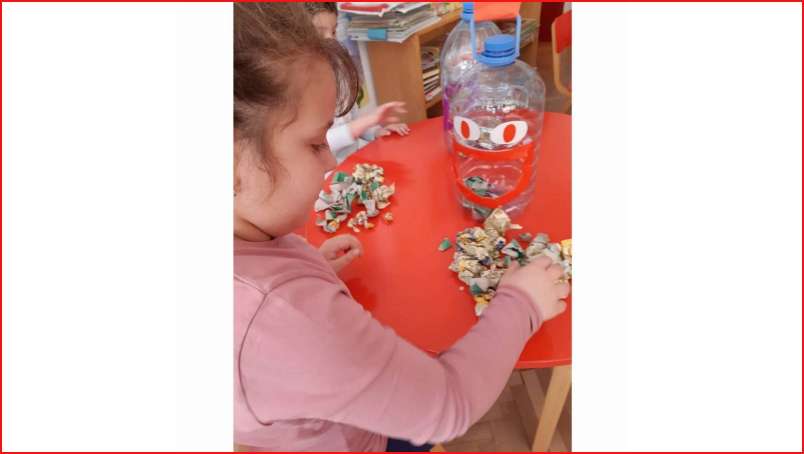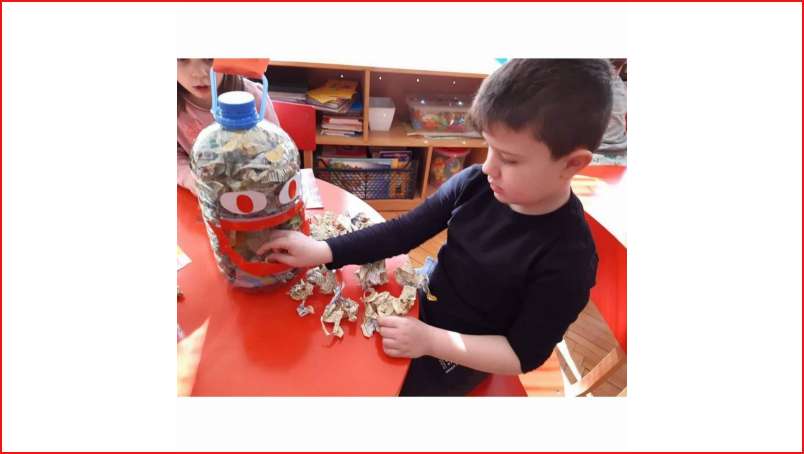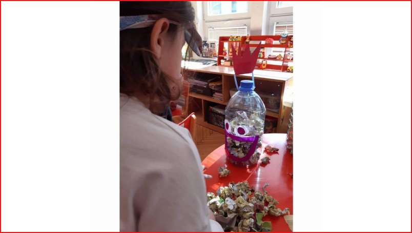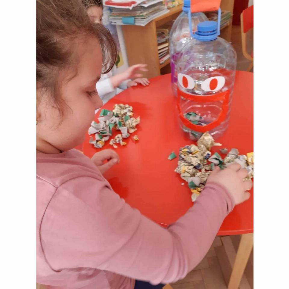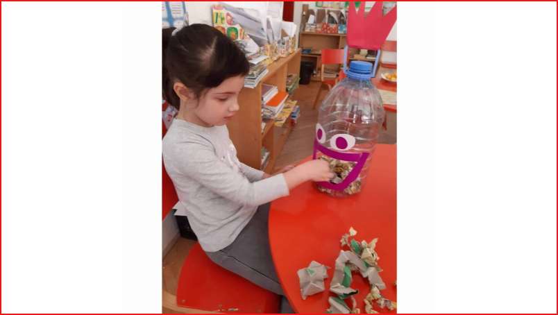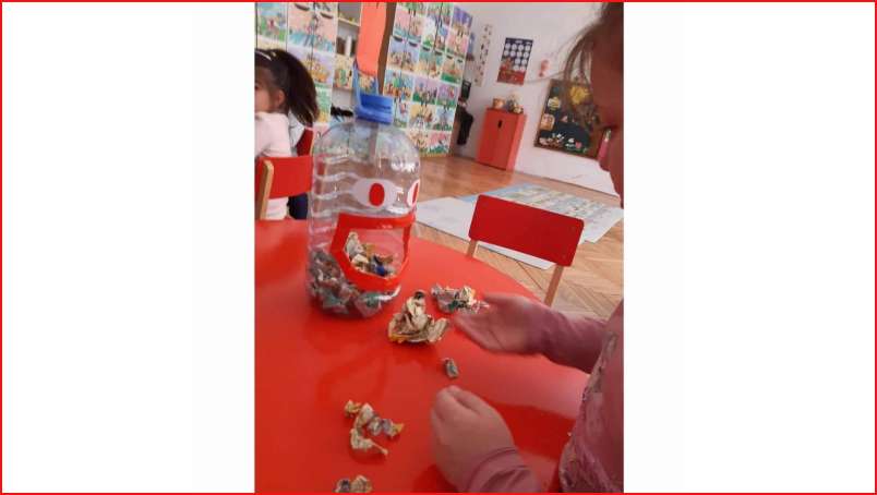 Цел: Да се усовршува развој на ситна мускулатура на рацете преку цепкање и гужвање хартии со различни дебелини комбинација на секвенци од неколку моторички движења, способност и развој на координирдинација око- рака за уфрлање до одредената цел - пластични шишиња, поттикнување на натпреварувачки дух кај децата и позитивни емоции.