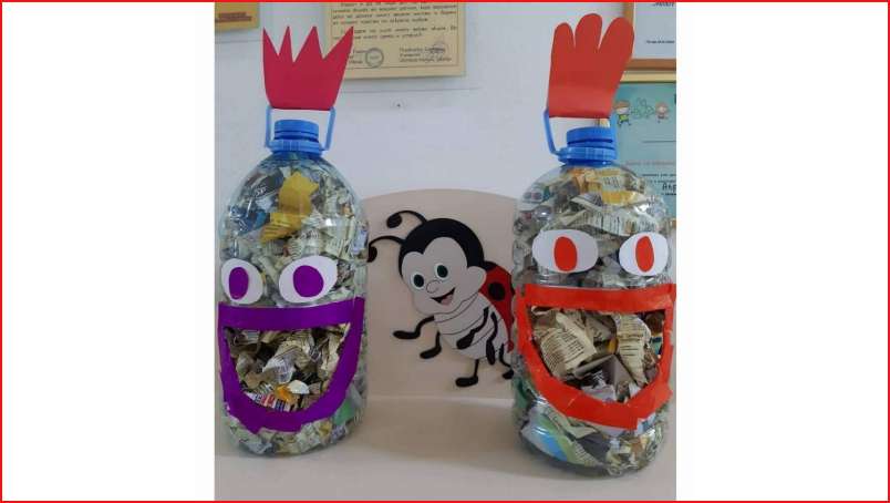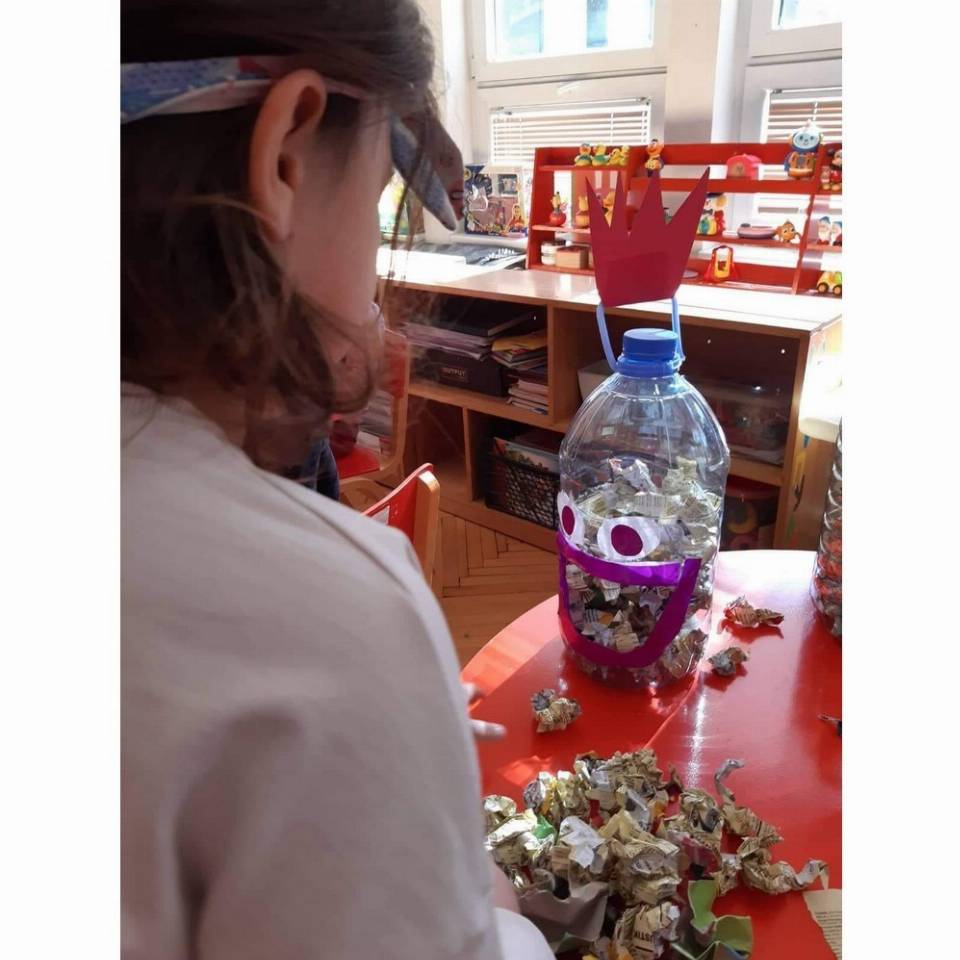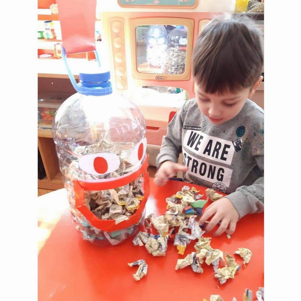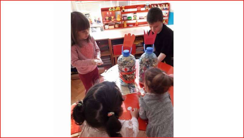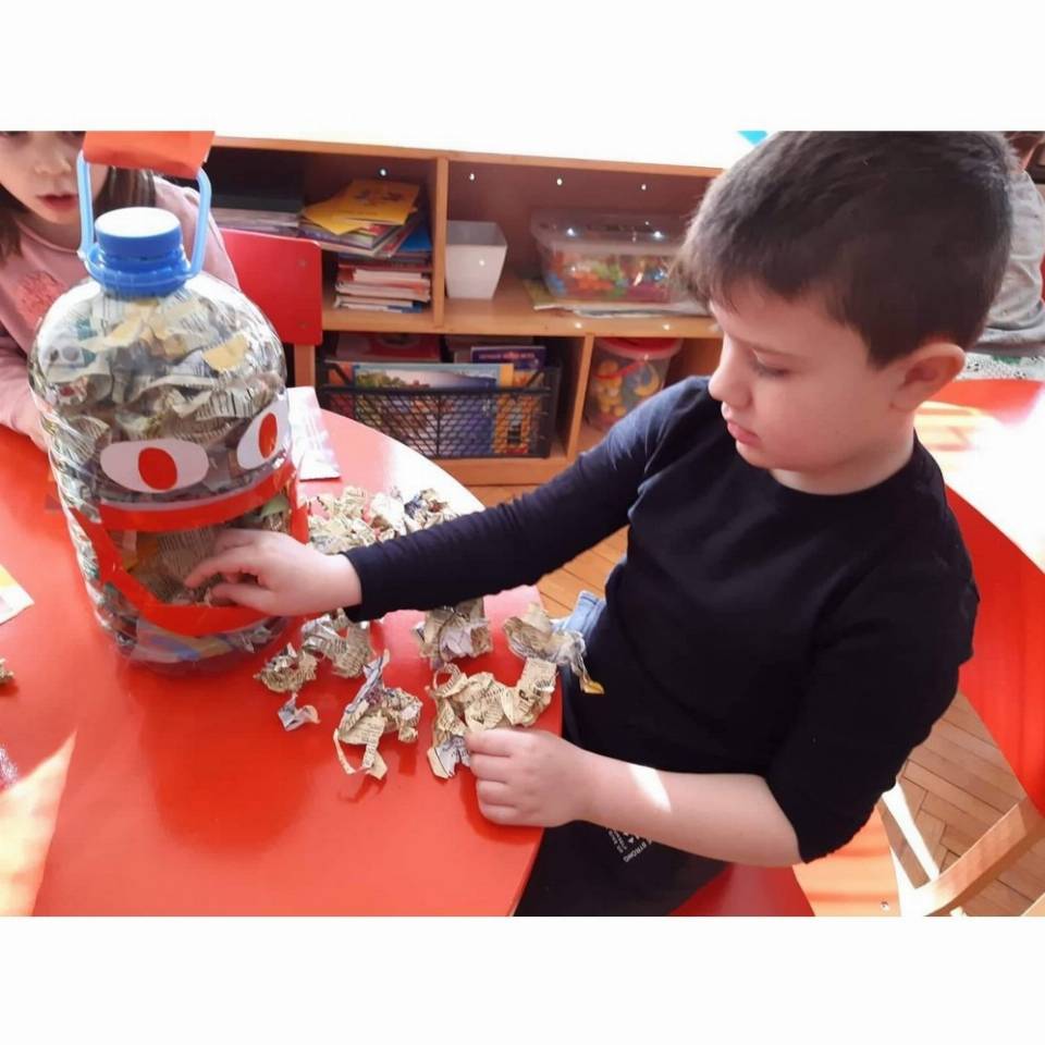 Цел: Да се усовршува развој на ситна мускулатура на рацете преку цепкање и гужвање хартии со различни дебелини комбинација на секвенци од неколку моторички движења, способност и развој на координирдинација око- рака за уфрлање до одредената цел - пластични шишиња, поттикнување на натпреварувачки дух кај децата и позитивни емоции.