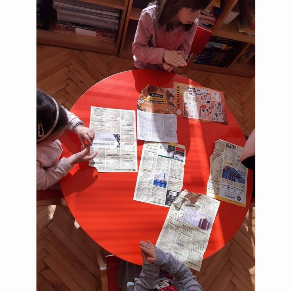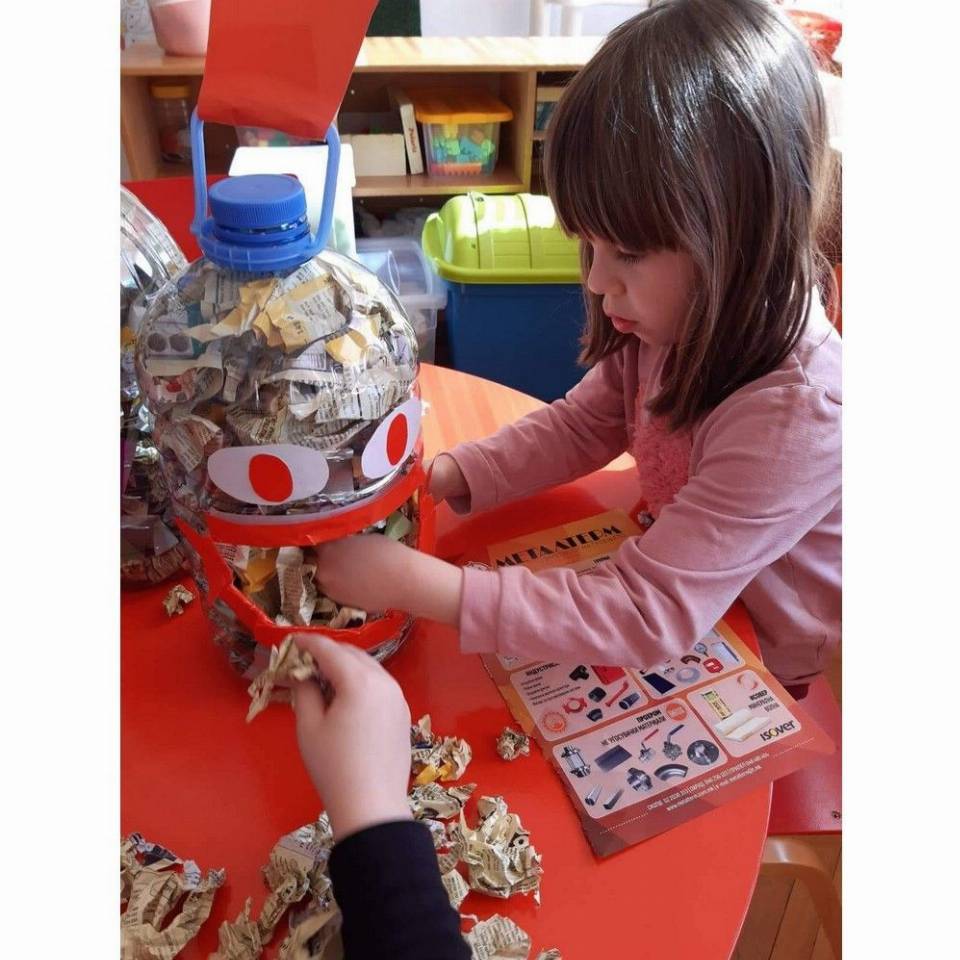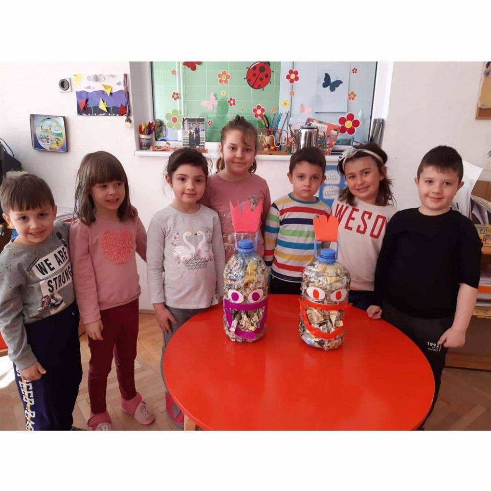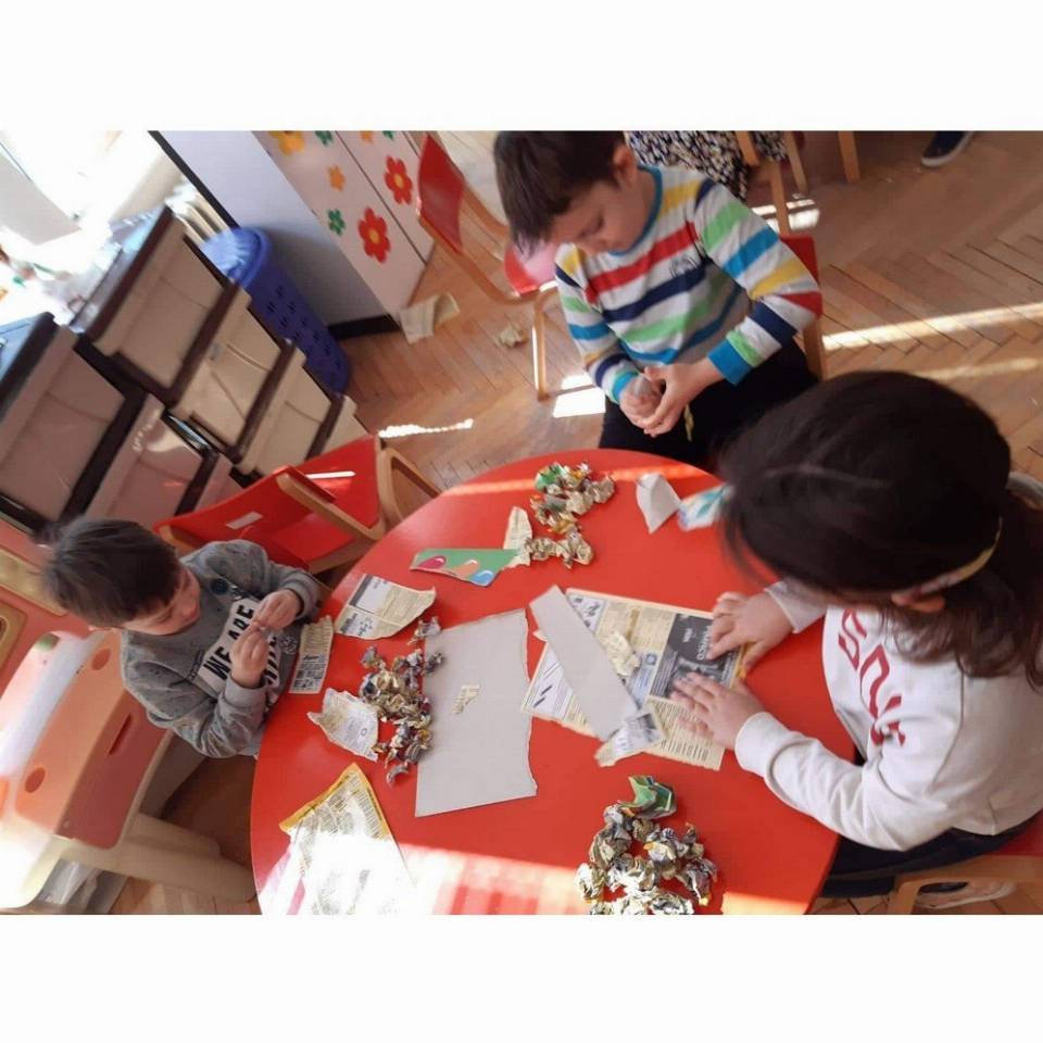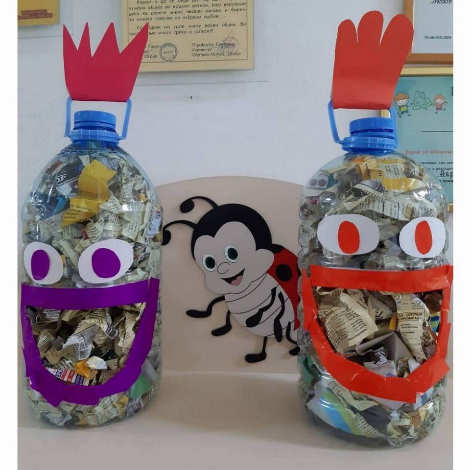 Цел: Да се усовршува развој на ситна мускулатура на рацете преку цепкање и гужвање хартии со различни дебелини комбинација на секвенци од неколку моторички движења, способност и развој на координирдинација око- рака за уфрлање до одредената цел - пластични шишиња, поттикнување на натпреварувачки дух кај децата и позитивни емоции.