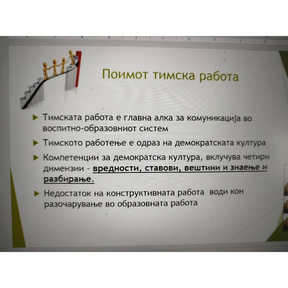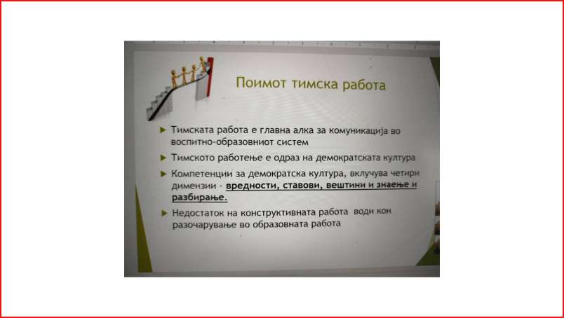 Цел - Да се подобрат компетенциите на вработените во однос на работата во тимот, споделување на искуства, поттикнување на тимска работа во работната организација.
