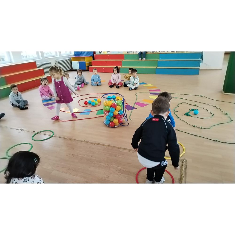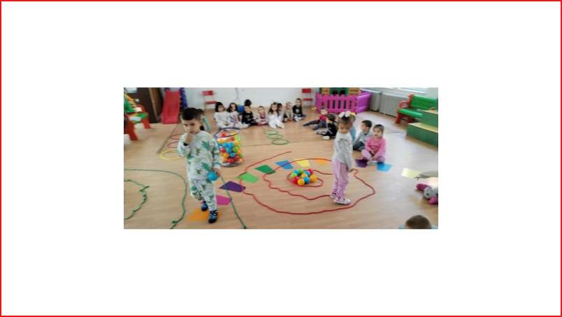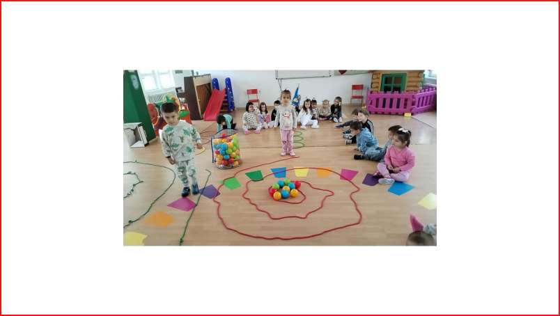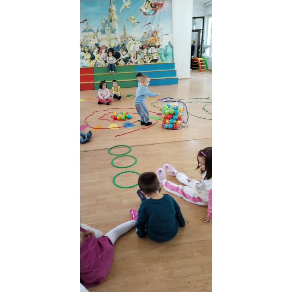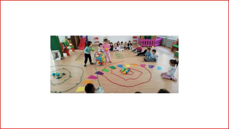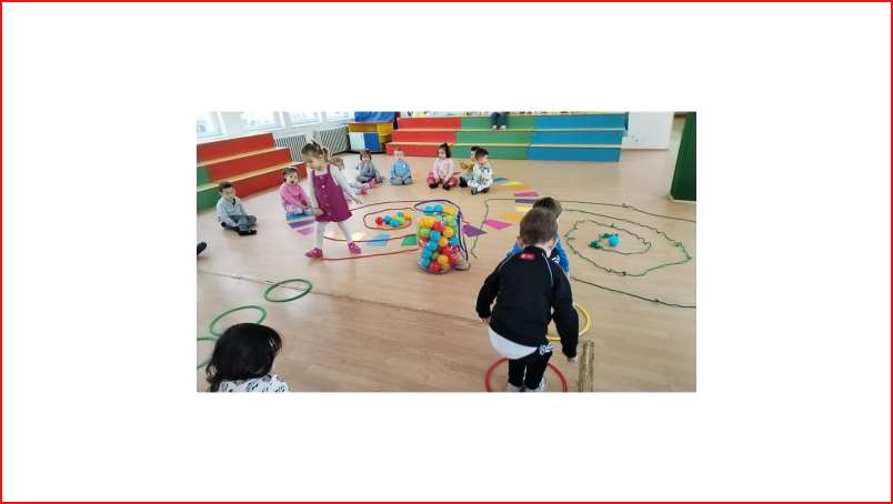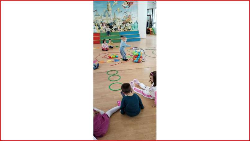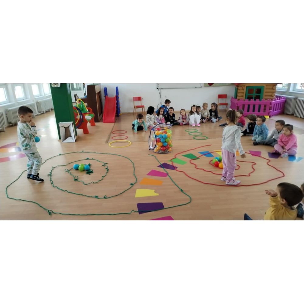 Цел - Да се поттикнат децата преку игра да ги совладаат основните движења (напред, назад, кружни) фокус и координација (рака - око) баланс, извршување на одредена задача пренос на топче со претходно сунижни пискоци.