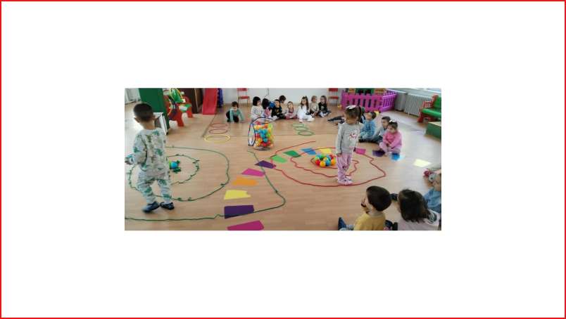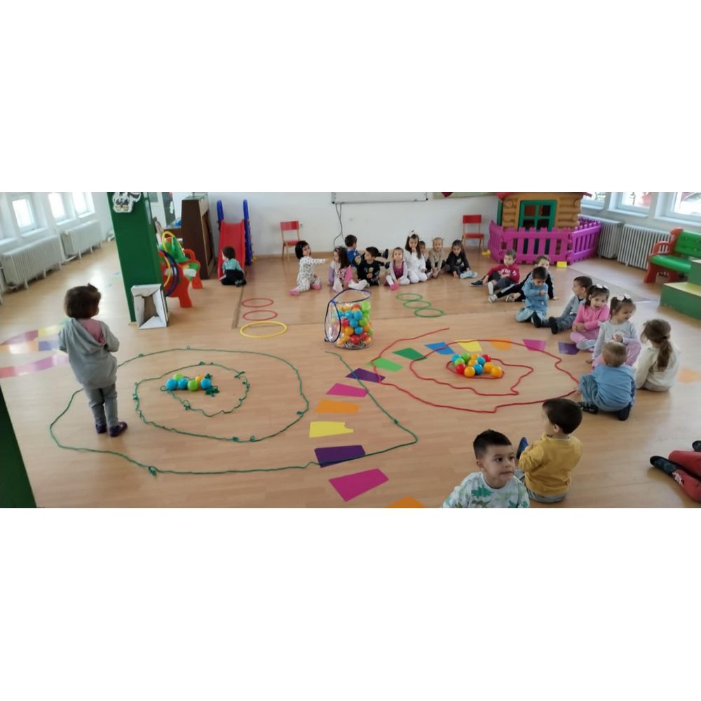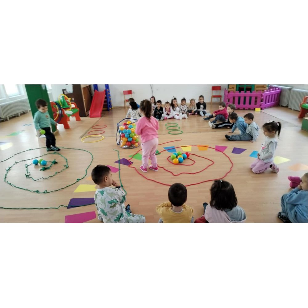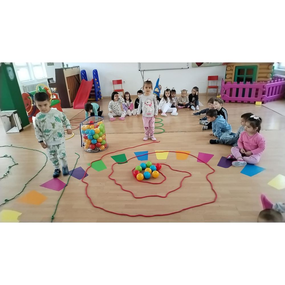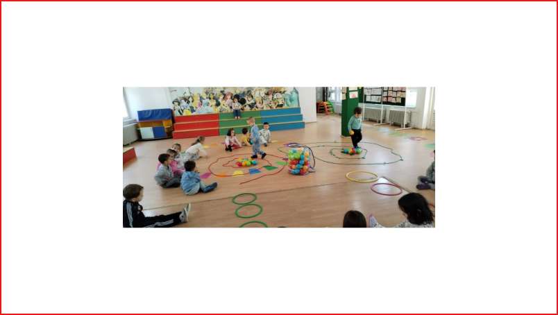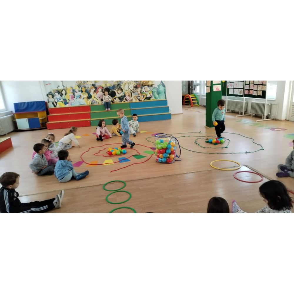 Цел - Да се поттикнат децата преку игра да ги совладаат основните движења (напред, назад, кружни) фокус и координација (рака - око) баланс, извршување на одредена задача пренос на топче со претходно сунижни пискоци.