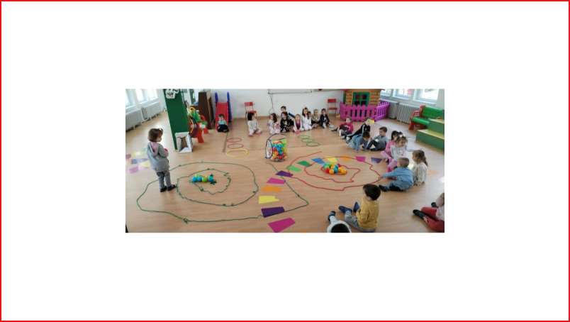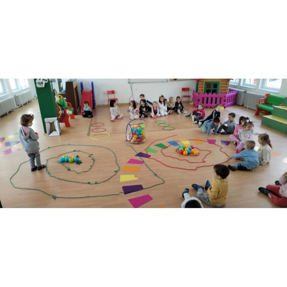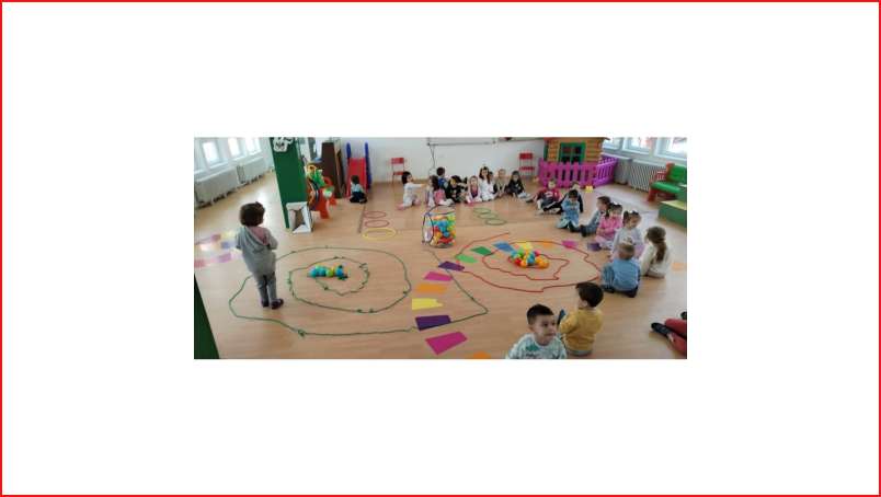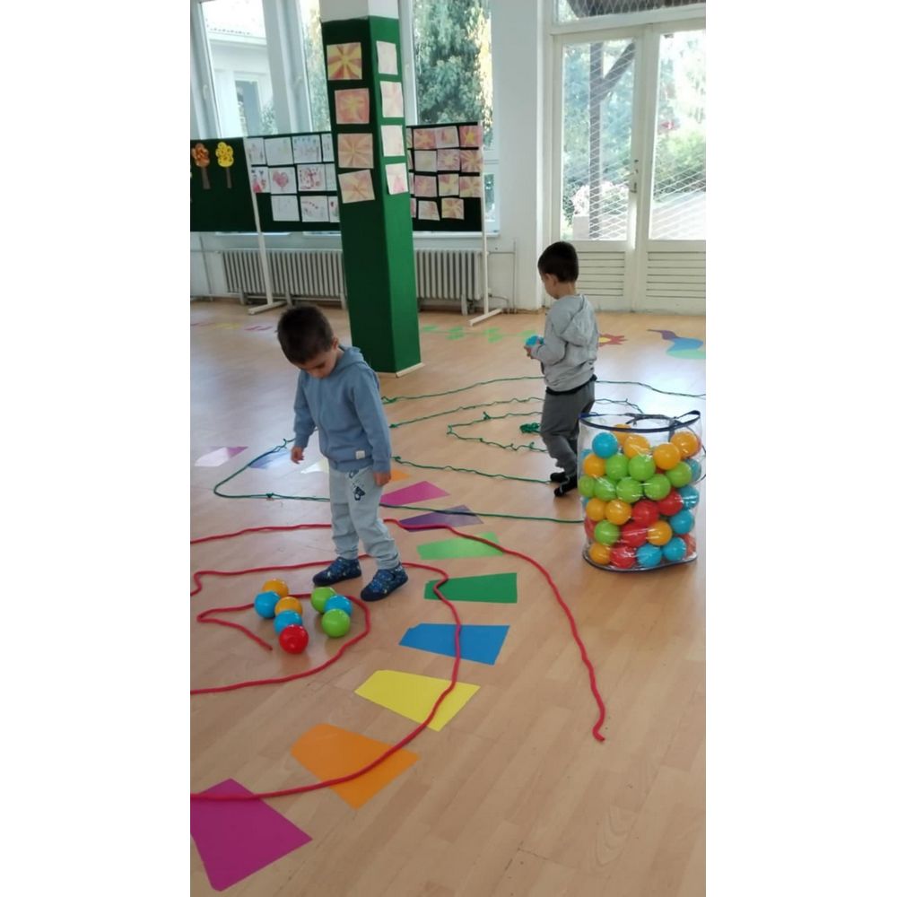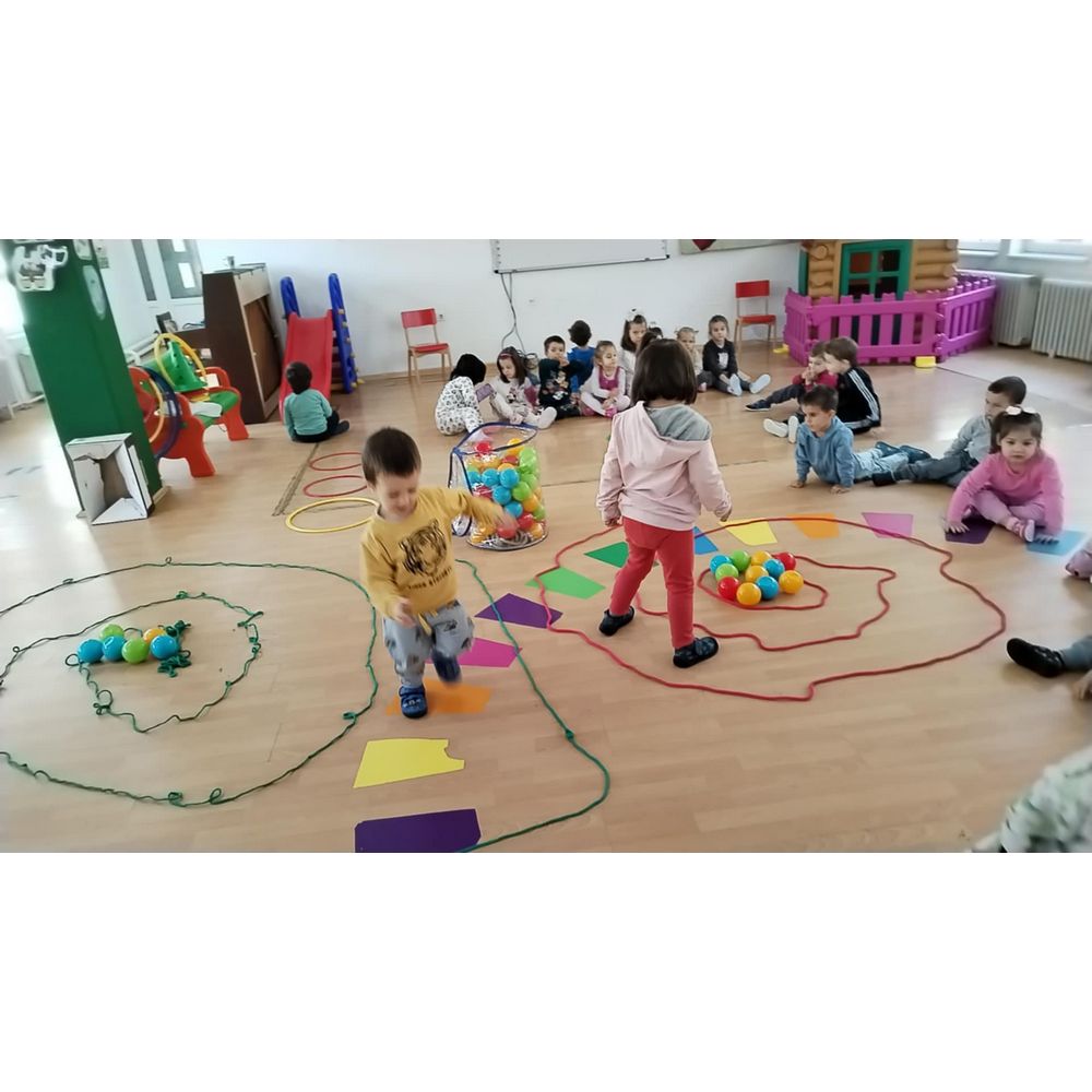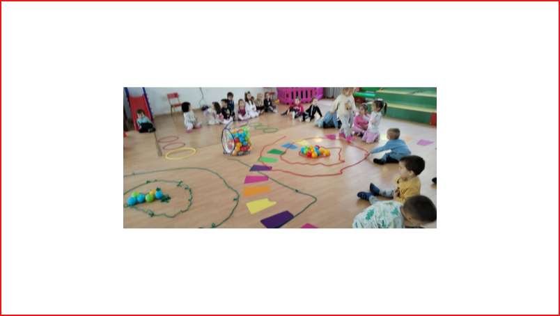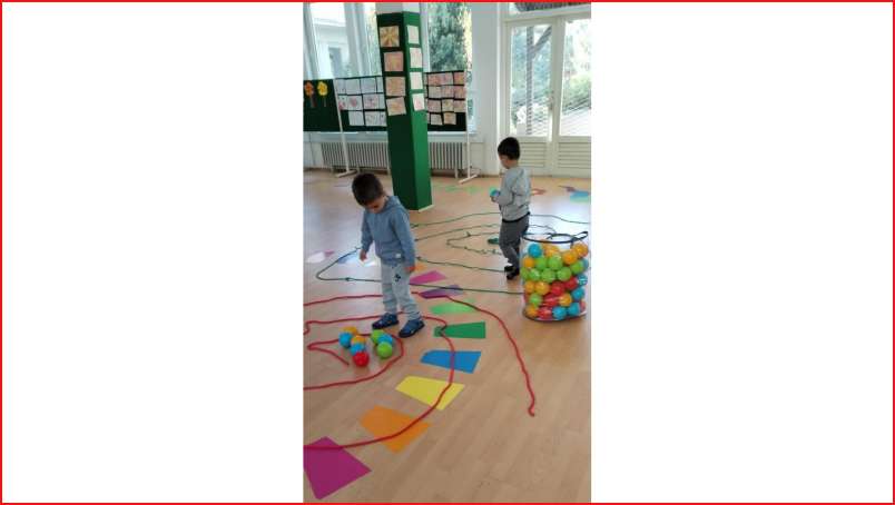 Цел - Да се поттикнат децата преку игра да ги совладаат основните движења (напред, назад, кружни) фокус и координација (рака - око) баланс, извршување на одредена задача пренос на топче со претходно сунижни пискоци.