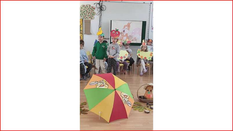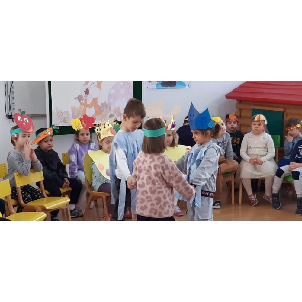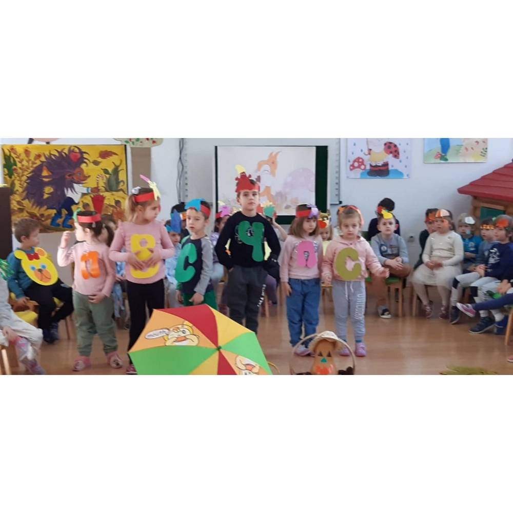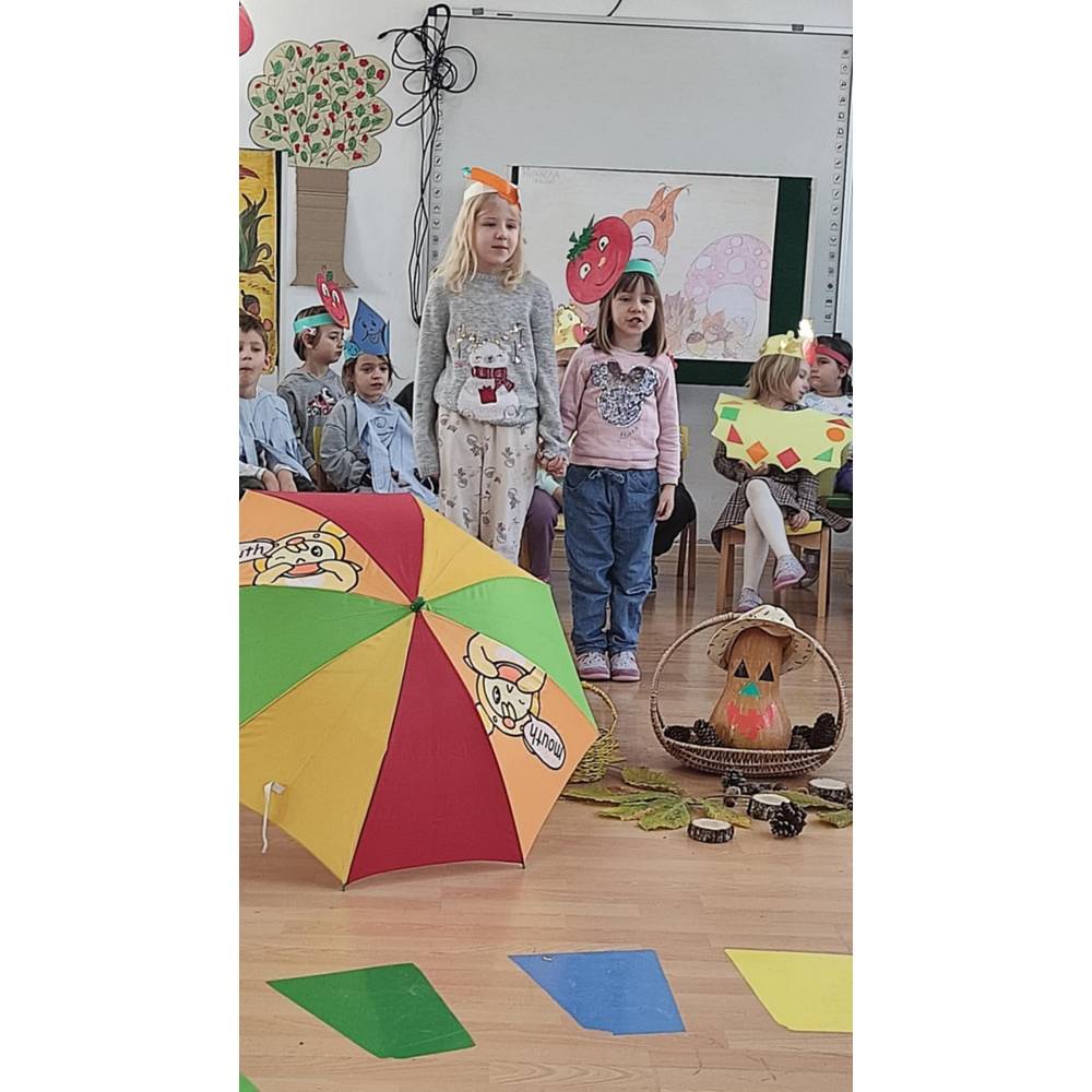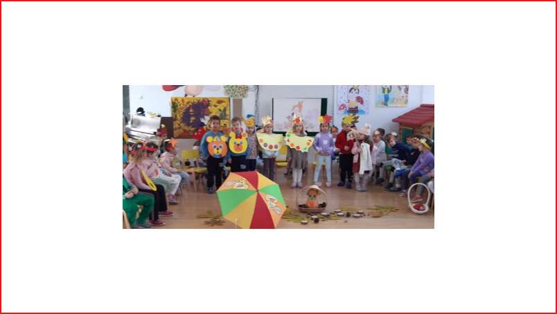 Цел - Да се поттикнат естетски чувства и позитивни доживувања кај децата од спектарот на бои на есента преку песни, стихови и драмска игра.