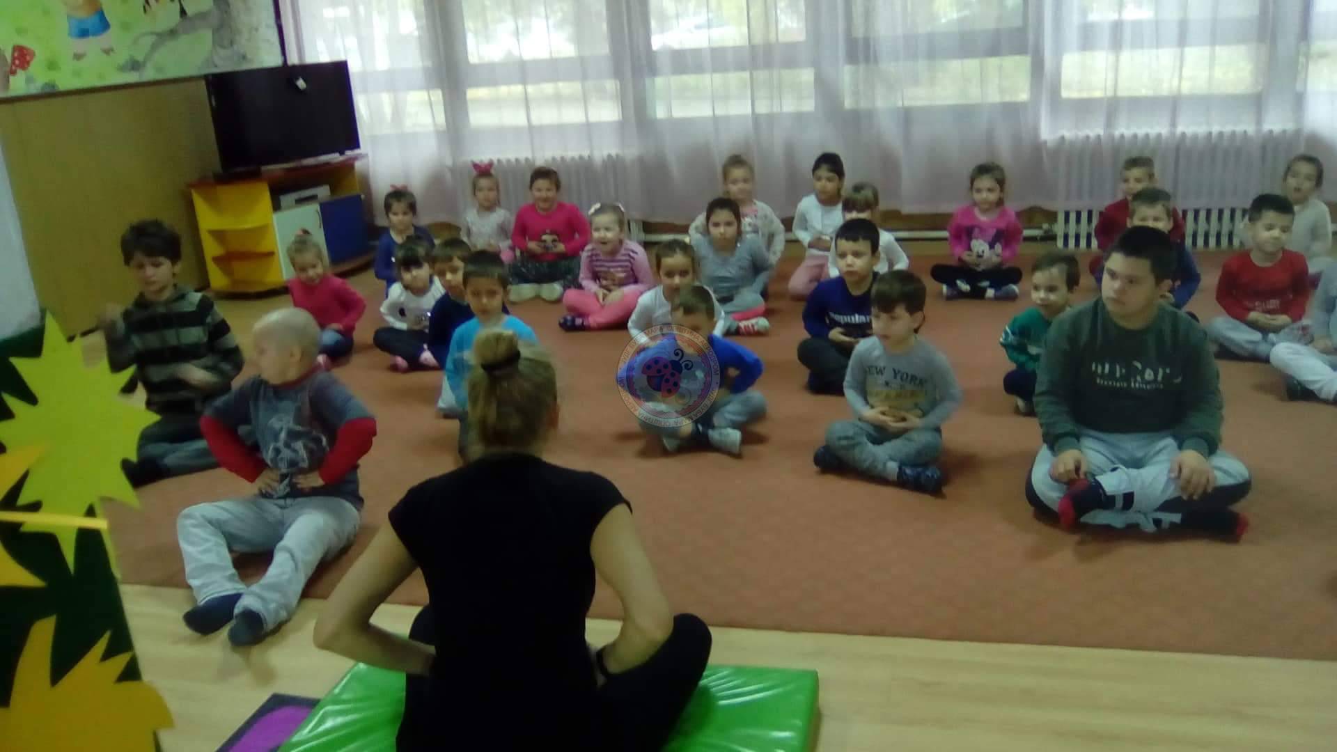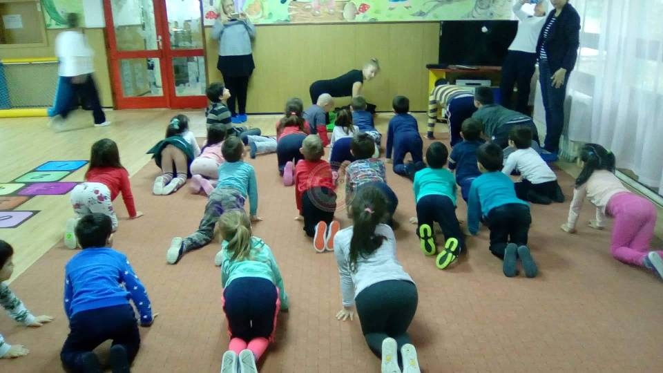 Сите заедно учествуваа на час по јога. Децата внимателно, спонтано и без многу напор започнаа да ги изведуваат класичните јога вежби - положба бебе, куче, маче, слонче и сл.
